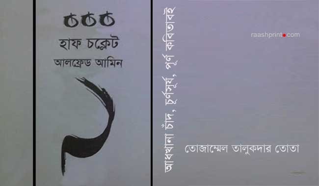 এহেন মস্ত গৌরচন্দ্রিকার আগে, একদম গোড়াতেই, একবার বলে নেয়া আমাদের কর্তব্য ছিল যে এই নিবন্ধটি সম্প্রতি-বেরোনো এক ছোট্ট-কলেবর কবিতাপুস্তকের সংবাদ প্রতিবেদিত করার লক্ষ্যেই লিখিত হতে চলেছে। এই ক্ষীণতনু পুস্তক/পুস্তিকার নাম ‘হাফ চক্লেট’, পুস্তকপ্রণেতা আনকোরা না-হলেও নবীন, কবি দ্বিতীয়-দশকে-লেখা-শুরু-করা আলফ্রেড আমিন।