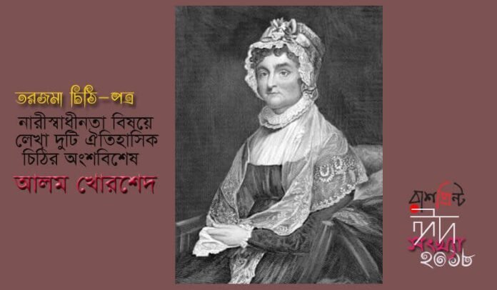 [১৭৭৬ সালে ফিলাডেলফিয়ায় টমাস জেফারসন, বেঞ্জামিন ফ্রাঙ্কলিন প্রমুখের সাথে বসে মার্কিন যুক্তরাষ্ট্রের দ্বিতীয় রাষ্ট্রপতি জন অ্যাডামস্ যখন সে-দেশের স্বাধীনতার ঘোষণা ও সংবিধান রচনা করছিলেন, তখন তাঁর পত্নী আবিগাইল অ্যাডামস তাঁকে লেখা একটি চিঠিতে নারীদের অধিকার বিষয়ে কিছু আব্দার করেছিলেন। এই চিঠির প্রত্যুত্তরে পত্নীকে যে-চিঠিটি লেখেন জন অ্যাডামস্, তাতে আবিগাইলের সনির্বন্ধ অনুরোধ রক্ষার অপারগতা জানিয়ে তিনি এক প্রকার ব্যাঙ্গের হাসিই হাসেন। আবিগাইল তাঁর দ্বিতীয় চিঠিতে স্বামীকে সেই শ্লেষের জবাব দেন কঠোর ভাষায়। এখানে সেই ঐতিহাসিক পত্র বিনিময়ের প্রাসঙ্গিক অংশের অনুবাদ প্রকাশিত হলো।]